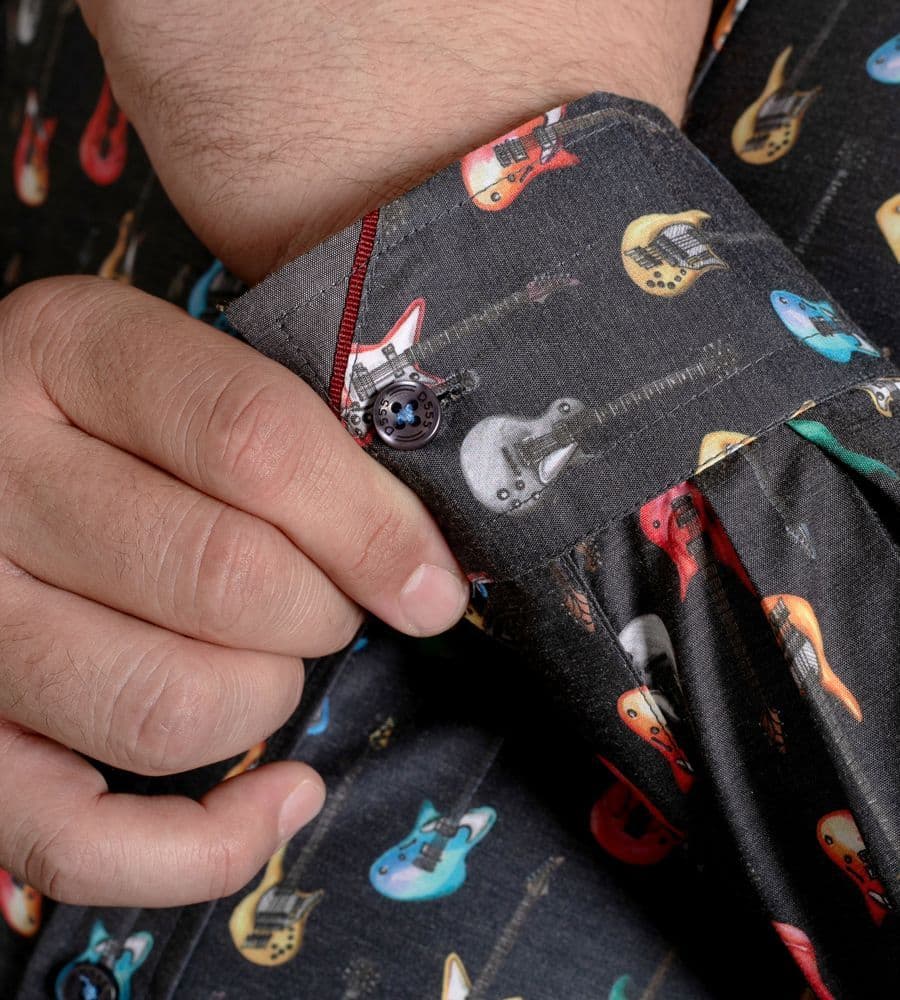 Make a bold style statement with this D555 Long Sleeve Guitar Printed Shirt. Designed for music lovers and fashion-forward individuals, this unique all-over guitar print shirt adds a touch of personality to your wardrobe. The charcoal grey colour base ensures versatility, while the cotton-poly blend fabric provides comfort, durability, and a soft feel against the skin.