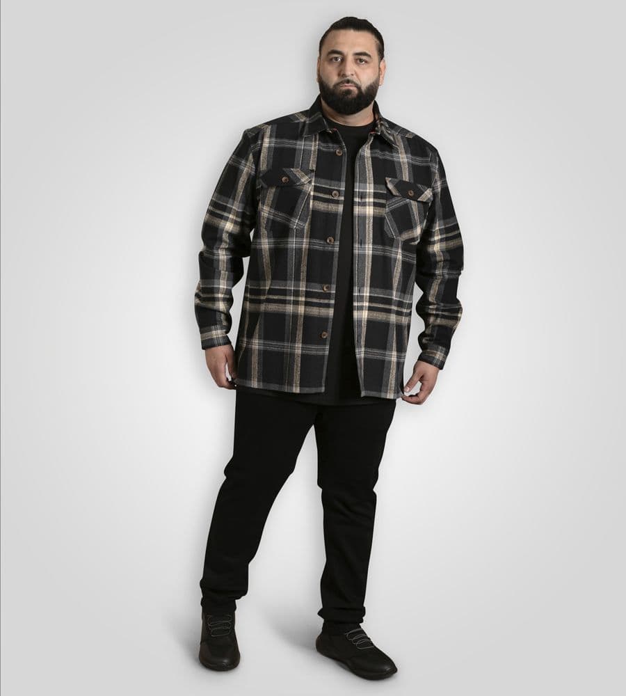 The D555 FALKIRK Long Sleeve Black & Grey Heavy Shacket Overshirt is the perfect hybrid between a shirt and a jacket, providing both warmth and effortless style. Featuring a bold black and grey check pattern, this heavyweight shacket is designed for versatility—ideal for layering over t-shirts, knitwear, or hoodies during cooler seasons. Made from 100% pure cotton, it ensures breathability, softness, and long-lasting durability, making it a staple piece for any casual or outdoor wardrobe.