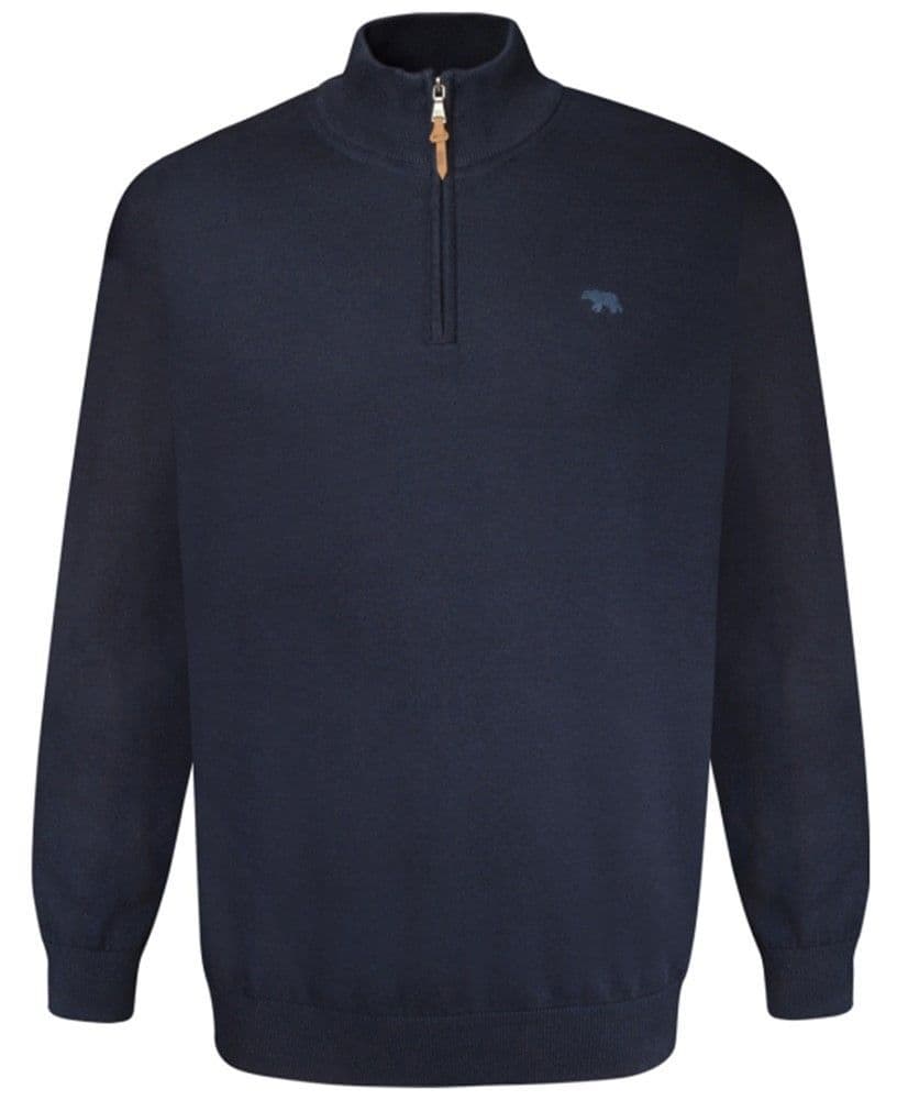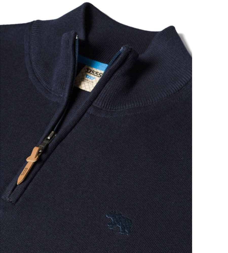 1/4 zip jumper from D555. Crafted from a soft pure cotton to offer optimal comfort and warmth and cut with a relaxed fit, the sweater is constructed with a zip neck and a tall collar. The jumper is available in navy with ribbed cuffs and hem. Complete with classic D555 branding embroidery to the chest