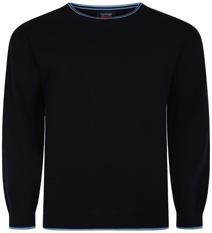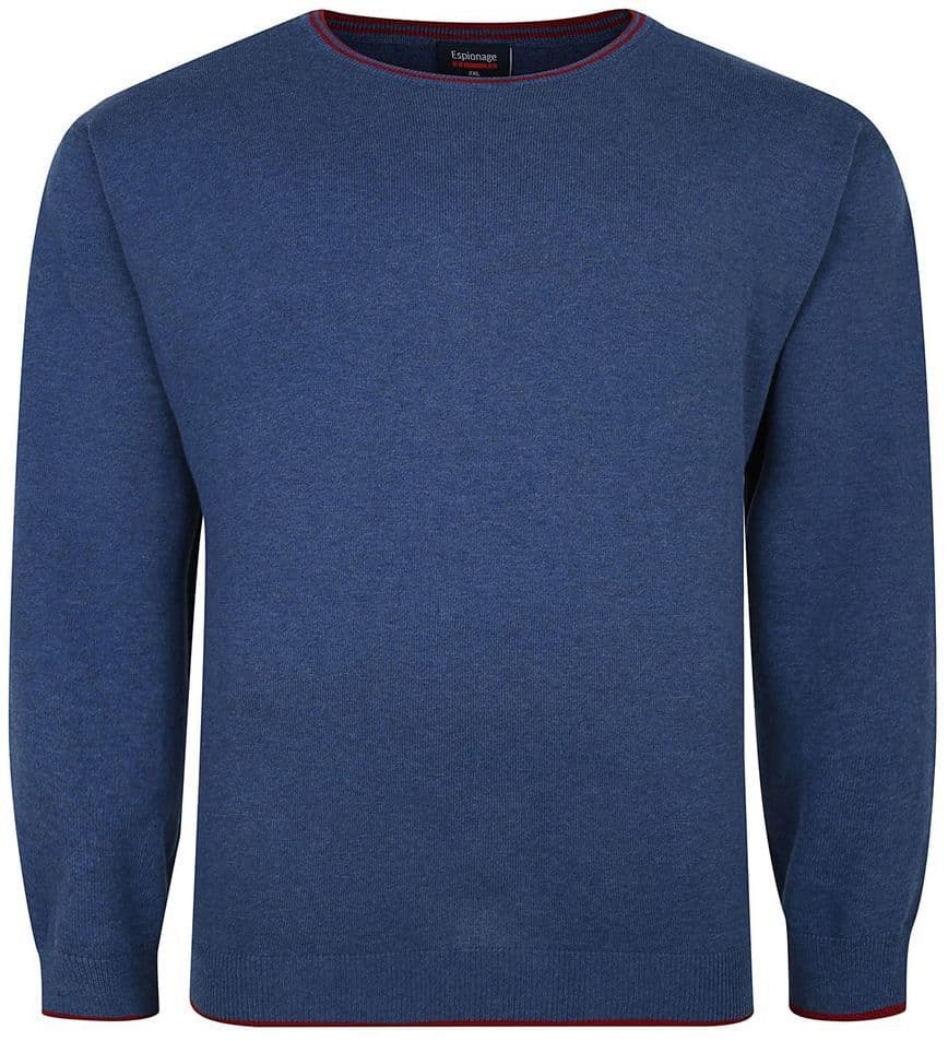 Available in denim blue or navy,. This big mans crew neck sweater by Espionage is 100% cotton and machine washable. Contrast tipping to neck, cuffs and hem
