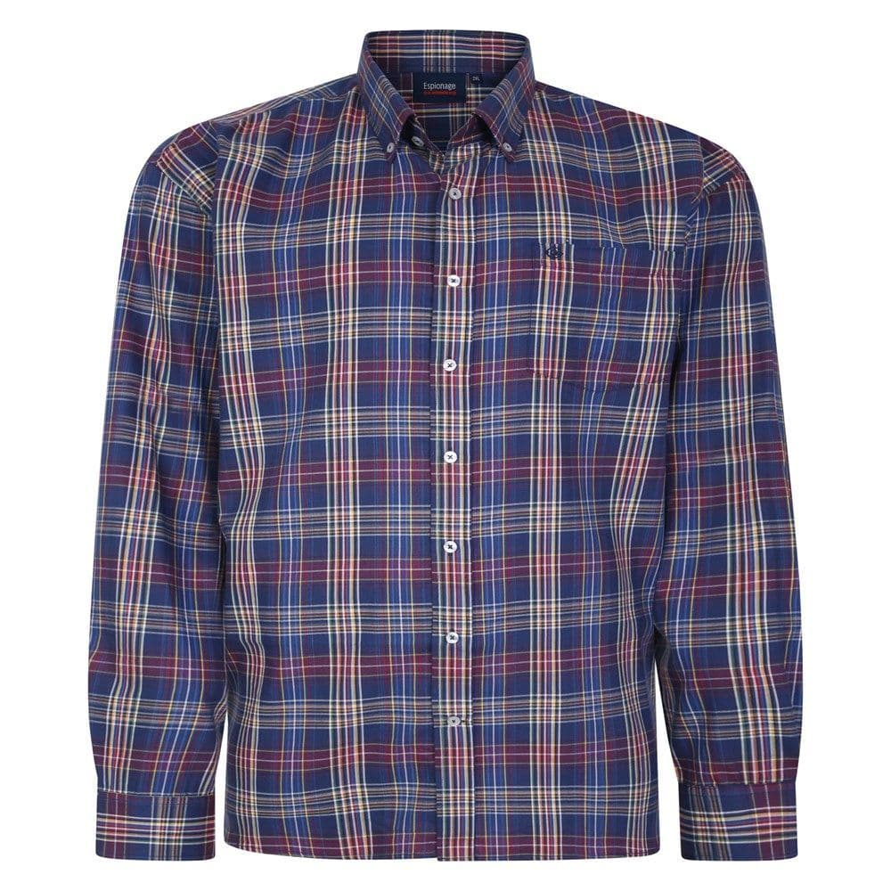 This stylish long sleeve shirt from Espionage has a button down collar, breast pocket and a slightly curved hem. In a purple colour check.