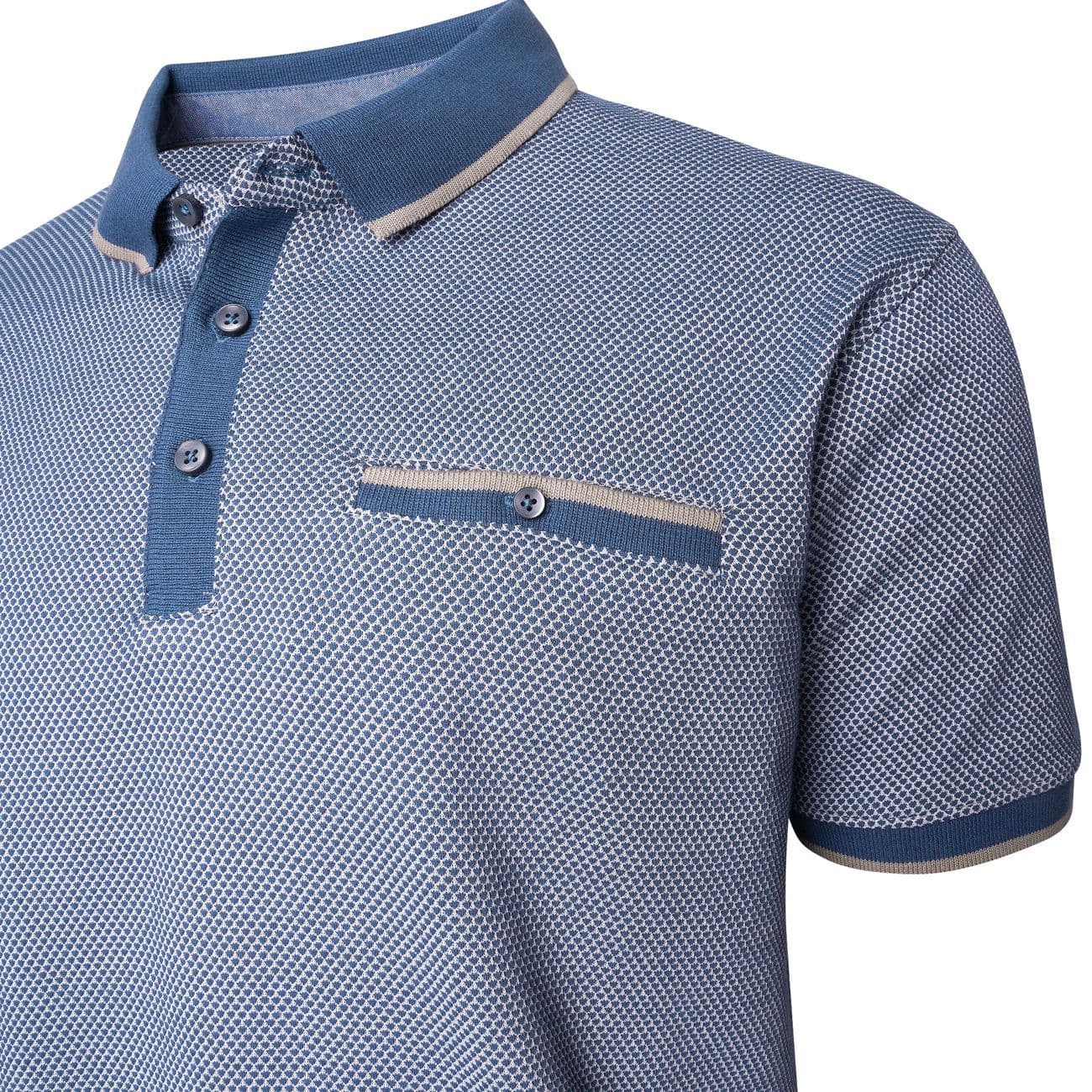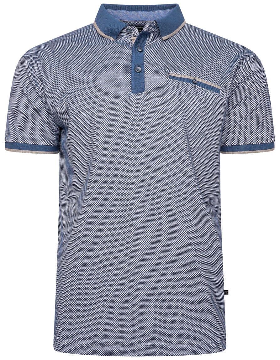 Men’s polo shirt from KAM. This polo is cut from 100% cotton with a small repeated pattern, contrast solid block colour to collar, pocket trim and cuffs. Button neck placket and a chest pocket.