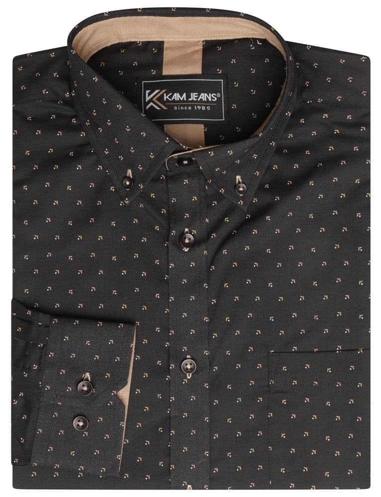 By KAM, this long sleeved shirt in black with a repeated small gold pattern. This shirt will look great with trousers, jeans or shorts.